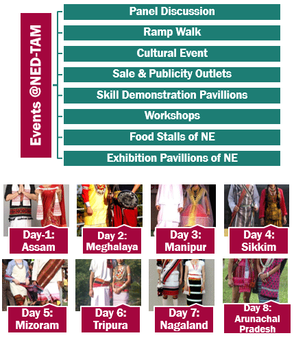 The event will be held for a period of 8 days, with each day dedicated to one of the States of North East. Every day will unfold the following events devoted to various crafts and artisans honoring the respective State: